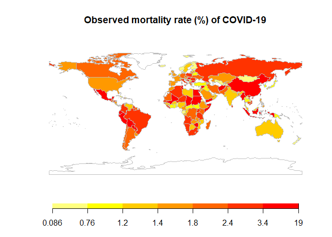 mortality_map<-mapCountryData( joinData, nameColumnToPlot="mortality", addLegend=F, catMethod="quantiles",mapTitle = "Observed mortality rate (%) of COVID-19")