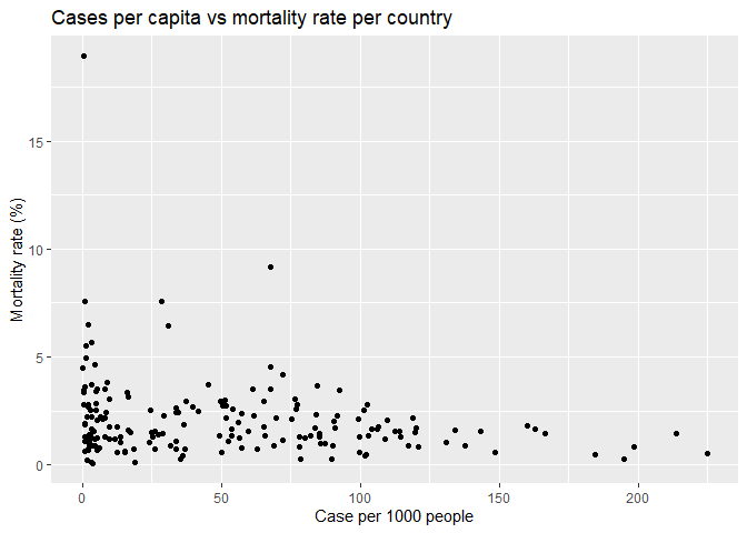 ggtitle('Cases per capita vs mortality rate per country')+