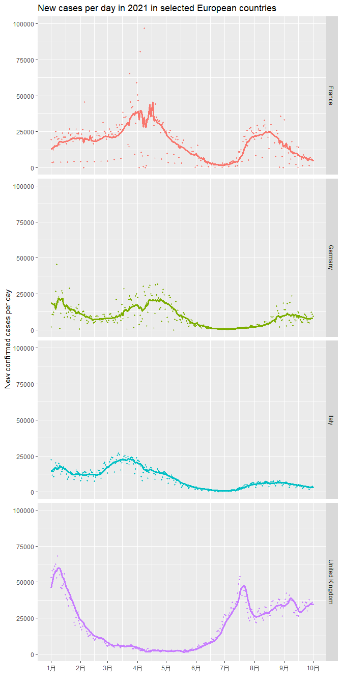 ggtitle('New confirmed COVID-19 cases per day in Sep 2021 in selected European countries')+