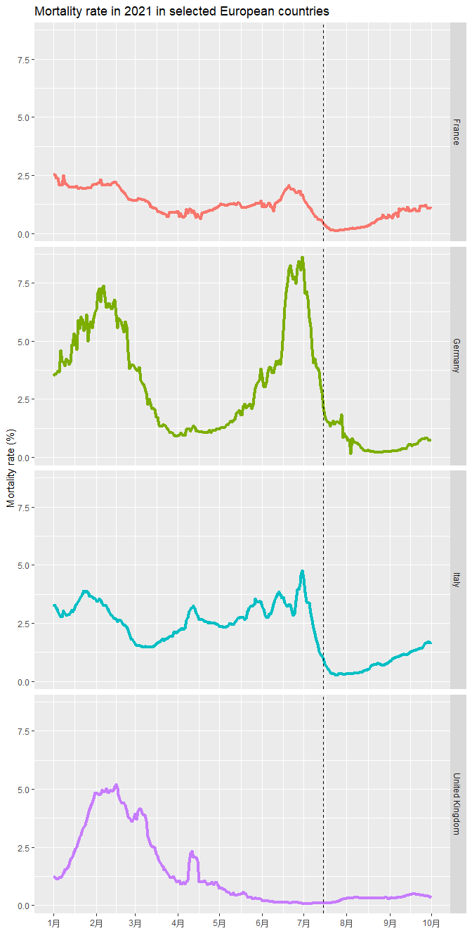 My interested European countries all have COVID vaccine widely available from June this year. About 60% population got vaccinated till July (dash line) in those countries. I made a time-series plot of mortality rate to see if the rate decreased after middle of July. rate in UK climbing to about 60% in UK from Jan to Jun 2021, I plot another time series plot to see if the mortality rate dropped when vaccination rate increased. Based on the figure, the mortality rate decreased in the all the listed European countries after 60% population got vaccinated.
